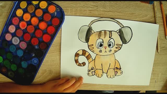 Рисую рыжего котёнка в наушниках