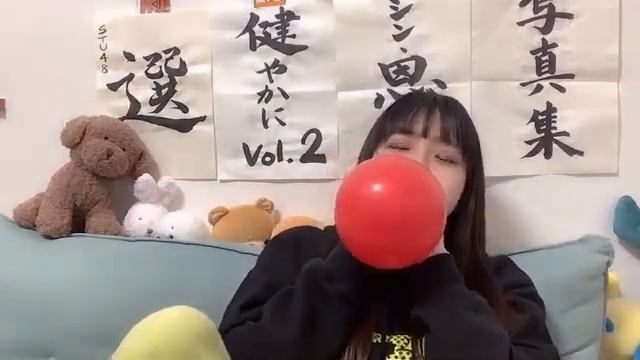 Японочка надувает шарики, но ей это трудно