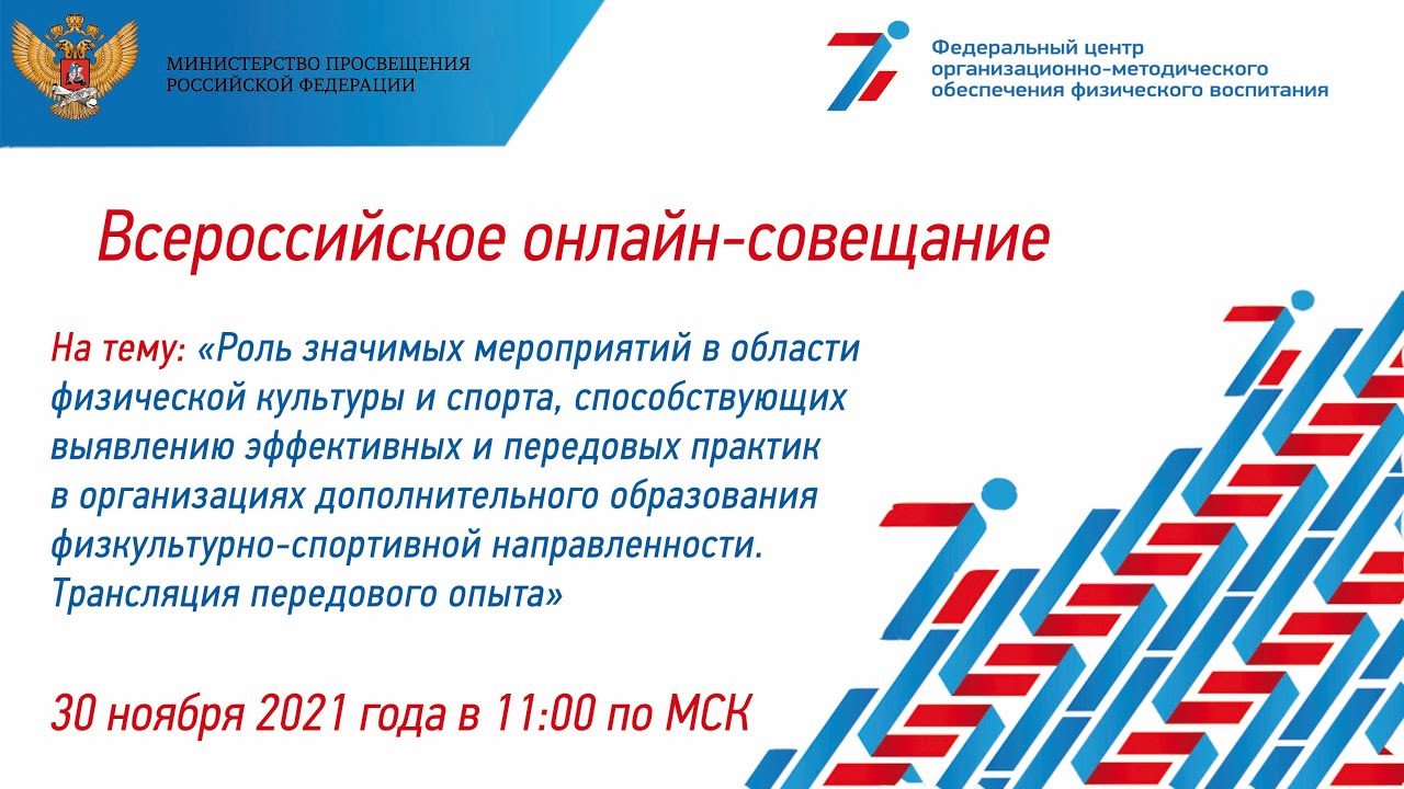 30 ноября 2021 года в 11:00 состоялось онлайн-совещание с представителями субъектов Российской Федерации, осуществляющие государственное управление в сфере образования по развитию физической культуры и спорта, руководителями государственных образовательных организаций дополнительного образования физкультурно-спортивной направленности, общеобразовательных организаций, педагогическими работниками физкультурно-спортивного профиля, представителями профильных образовательных организаций высшего профессионального образования, федераций по видам спорта, общественных объединений и др. заинтересованных организаций на тему: «Роль значимых мероприятий в области физической культуры и спорта, способствующих выявлению эффективных и передовых практик в организациях дополнительного образования физкультурно-спортивной направленности. Трансляция передового опыта».