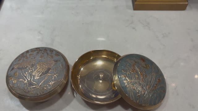 #АНТИКВАР Шкатулка/ пудренница - 2 шт Латунь Почувствуйте красоту искусства Чокина с этой японской золотистой шкатулкой для безделушек. Чокин - древнее искусство, восходящее к 12 веку, включает в себя тонкую гравировку металлов с глазировкой — технику, которая когда-то использовалась для украшения доспехов и оружия самураев. Эта шкатулка для безделушек демонстрирует элегантность этого вида искусства с замысловатым изображением цветов, птиц и животных, подчеркнутых на золотом фоне. Латунное основание коробки придает ей винтажный шарм, делая ее предметом восхищения коллекционеров. Имея размеры 8 см в диаметре, 3,5 см в высоту и 120 гр в весе - это идеальный держатель для ваших ценных вещей. Окунитесь в историю японского ремесла с этим изысканным изделием от Flitcroft Цена - 2000/ шт