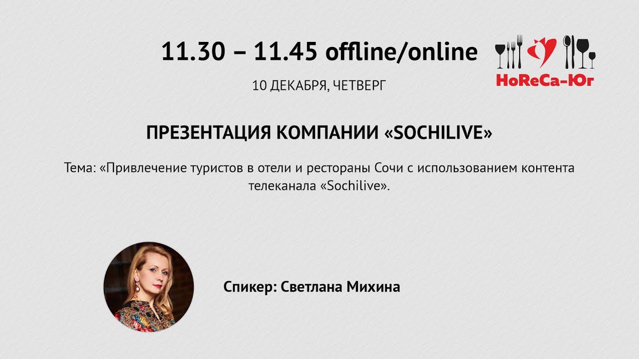 Профессиональное мероприятие индустрии гостеприимства «HoReCa- Юг – 2020» https://horeca.soud.ru/ Тема: «Привлечение туристов в отели и рестораны Сочи с использованием контента телеканала «Sochilive». Спикер: Светлана Михина