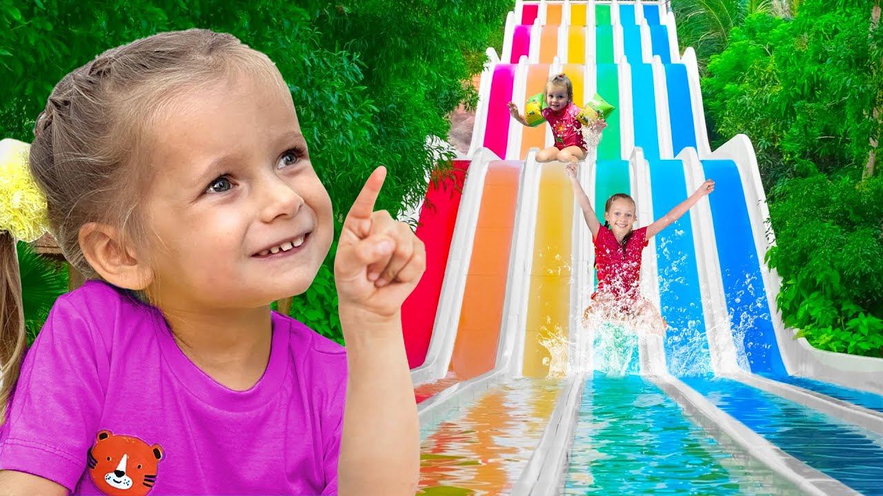 Маша и сёстры играют в аквапарке — кто первым скатится по яркой водной горке?