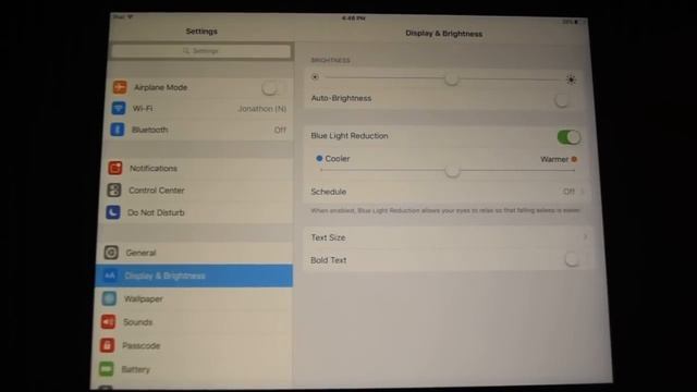 iOS 9.3 Night Shift (Blue Light Reduction) demo, running on iPad Mini 2. In this video, the camera is keeping constant color temperature-- all color changes seen are the effect of iOS 9.3's Night Shift feature.