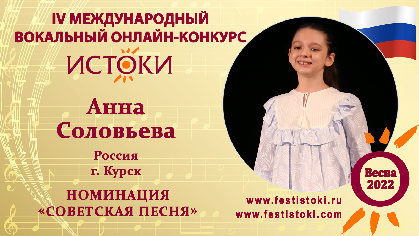 Лауреат I степени IV Международного вокального онлайн-конкурса «Истоки».Весна-2022. Номинация "Советская песня". Песня "Цвети, земля моя!". Музыка Павла Ермишева, стихи Михаила Суворова. Сайт: www.festistoki.ru / www.festistoki.com E-mail: festistoki@mail.ru