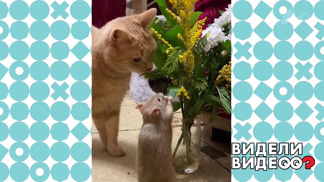 Крысенок Филя и кошка Персея вместе нюхают букет мимозы.