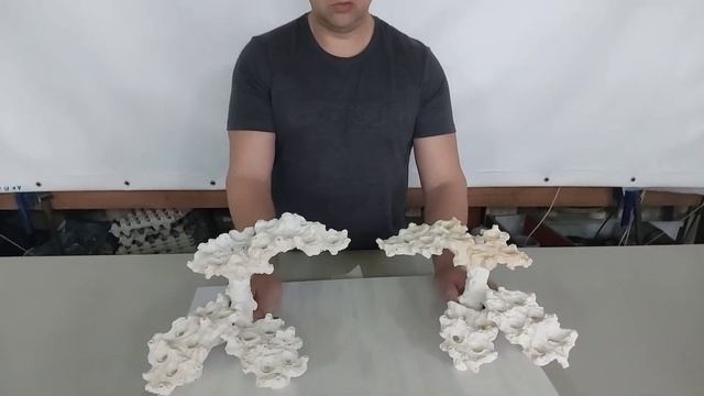 Универсальный фронтальный разборный комплект декораций из биокерамики размером 61 х 22 х 24 см для морского аквариума. Состоит из двух разборных модулей и путём раздвигания их друг от друга можно увеличивать длину скейпа. По изделию 36 плашкомест под плашки диаметром 2 см, плашки идут в комплекте.