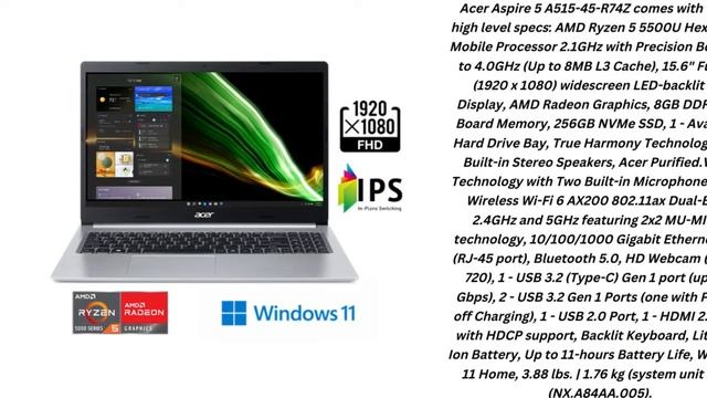 Acer Aspire 5 A515-45-R74Z comes with these high level specs: AMD Ryzen 5 5500U Hexa-Core Mobile Processor 2.1GHz with Precision Boost up to 4.0GHz (Up to 8MB L3 Cache), 15.6" Full HD (1920 x 1080) widescreen LED-backlit IPS Display, AMD Radeon Graphics, 8GB DDR4 On-Board Memory, 256GB NVMe SSD, 1 - Available Hard Drive Bay, True Harmony Technology, Two Built-in Stereo Speakers, Acer Purified.Voice Technology with Two Built-in Microphones, Intel Wireless Wi-Fi 6 AX200 802.11ax Dual-Band 2.4GHz and 5GHz featuring 2x2 MU-MIMO technology, 10/100/1000 Gigabit Ethernet LAN (RJ-45 port), Bluetooth 5.0, HD Webcam (1280 x 720), 1 - USB 3.2 (Type-C) Gen 1 port (up to 5 Gbps), 2 - USB 3.2 Gen 1 Ports (one with Power-off Charging), 1 - USB 2.0 Port, 1 - HDMI 2.0 Port with HDCP support, Backlit Keyboard, Lithium-Ion Battery, Up to 11-hours Battery Life, Windows 11 Home, 3.88 lbs. | 1.76 kg (system unit only) (NX.A84AA.005). Aer aspire 5 A515-45-R74Z Slim laptop, Aer aspire 5 a515-45-r74z slim laptop review, Aer aspire 5 a515-45-r74z slim laptop 15.6 , Aer aspire 5 A515-45-R74Z slim laptop I 15.6” Full, Aer aspire 5 a515-45-r74z slim laptop I 15.6” Full hd ips amd ryzen 5, acer aspire 5 slim laptop good, https://amzn.to/3PmECoF facebook page link:https://www.facebook.com/profile.php?id=100087188107620 twiter link:https://twitter.com/home pinterest link:https://www.pinterest.com/mstmorioumbegum/