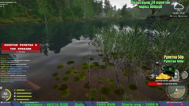 Поддержка донатом https://new.donatepay.ru/@1032463 Альтернативный донат https://www.donationalerts.com/r/kalyamba11 5536913964533059 карта Тинькоф Если стрим лагает,смотри стрим на трово https://trovo.live/s/Kalyamba_na_Ribalke Мой ВК - https://vk.com/kalyantv НИК в игре kalyan11 НАШ ДИСКОРД СЕРВЕР https://discord.gg/3ZeEDGs5h6 Заказ водоема на 1 час - 500р ( весь стрим 2500р ) Модерка на канале 1300р ( каждая следующая на 100р больше) ✅Призы в рулетке "ЗОЛОТАЯ" 500р ✔ ЗОЛОТО ✔ ПРЕМ ✔ КАТУШКИ РАПТОР 40, ВЕНГИ, ТАЙГА, СИЛЬВЕР 80, И другие ✔ ПАЛКИ ПИЛКЕРНАЯ, ДОНКА МОРСКИЕ, ✔ РОД ПОД, СТУЛЬЯ ✅Призы в рулетке СТАНДАРТ : 100р ✔ катушкИ РАПТОР 40, ВЕНГИ, ТАЙГА, СИЛЬВЕР 80, И другие ✔ катушки 60 для медного ( ЭВИИ, НАТОРЫ, ГОЛДА, и тд) ✔ ПИЛКЕРНОЕ УДИЛИЩЕ КОРОЛЕВА ОКЕАНА ✔ Морское Донное удилище ✔ прем ( 3, 7, 30 дней) ✔ золото ( 1, 3, 5, 10, 20 ,50) ✔ билет на море ( 1, 3, 5 дней) ✔ голд наживка и др. ✅Призы в рулетке "СТАРТОВАЯ" 50р ✔ катушка Венга ✔ катушка "silver80" ✔ катушка "БЕЛЫЙ КАЛИБР" ✔ катушка "Черный калибр" ✔ катушка "Протон" ✔ катушка "Нарга 6000" ✔ Набор Фидерист и спинингист ✔ Карповик Фортуна ✔ фидерные удилища ✔ прем, золото, алкашка, наживки и тд P.s Рулетка это не казино, а награда за поддержку стримера. Вечный ТОП ПОДДЕРЖКИ (10.06.2025) 1. Леха сварной 214 572 2. Dimon_pokemonchik 127 034 3. Skreb79 103 061 4. Interceptor 96 230 5. FishRus86 82 500