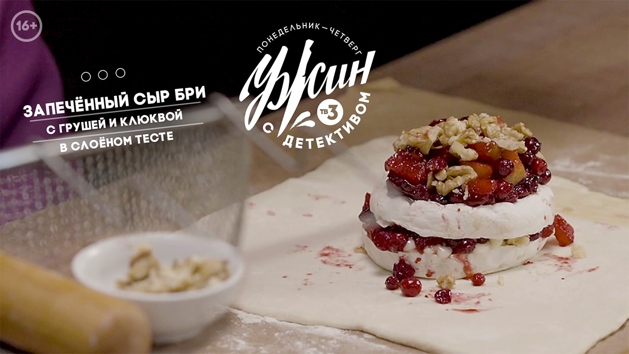 Вот и пришло время для сладенького! Специально для "Ужина с детективом" шеф Дмитрий поделился с нами рецептом великолепного десерта? 16+ Для его приготовления нам понадобятся: Сахар-песок – 3 ст. л. Сливочное масло – 50 г. Клюква – 60 г. Груша пакхам большая – 1 шт. Грецкие орехи – 50-60 г. Тесто слоеное бездрожжевое ("Звездное" от "Хлебного Дома") Сыр бри круглый – 1 шт. Мороженое пломбир – 70-100 г. Шаг 1. Сахар-песок растопить до карамельного цвета, добавить сливочное масло, размешать и выложить нарезанную грушу слайсами с клюквой. Тушить пару минут. Шаг 2. Содержимое выложить на тарелку остужать, а всю жидкость (карамель) – оставить в сковороде. Шаг 3. Слегка присыпать стол мукой, разделить слоеное тесто на 2 части, раскатать одну часть в квадрат, чтобы тесто покрывало противень, а сыр бри разрезать пополам и поставить в центр противня. Шаг 4. Выложить начинку и часть грецких орехов, накрыть второй половиной слоеного теста и снова положить начинку с орехами. Шаг 5. Смазать края теста яйцом, залепить их, потом смазать верхний слой. Шаг 6. Отправить в духовку на 20 минут при 200 °С. После чего дать остыть 10 минут. Оставшуюся загустившуюся карамель вылить сверху и подать на стол с шариком мороженого. Десерт готов! Приятного аппетита♥️