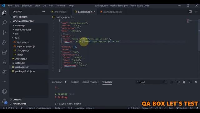 Mocha - Command Line Options - Parallel Tests, Bail, Different Reports, Test Filters Pre-requisite – Previous Parts STEPS:- Check command line usage Run tests using npm test with an example of --fgrep, grep --timeout 50000 --parallel --bail -f 'async'