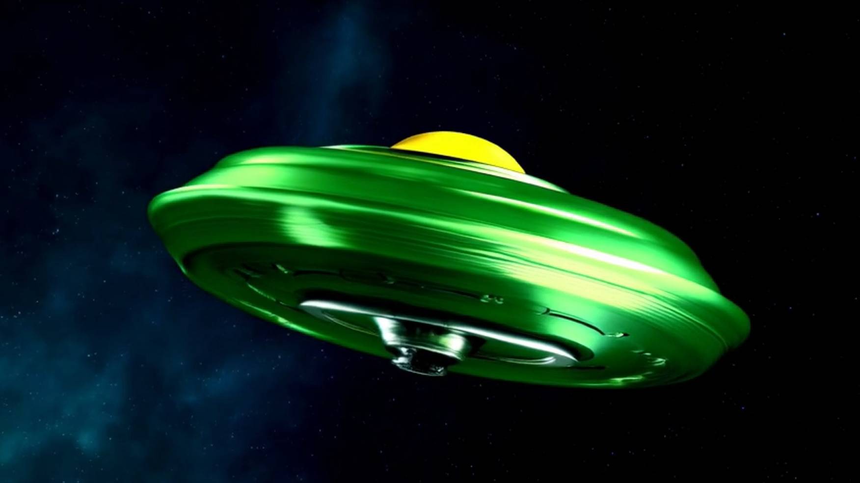 НЛО зелёного цвета с жёлтым над морем.