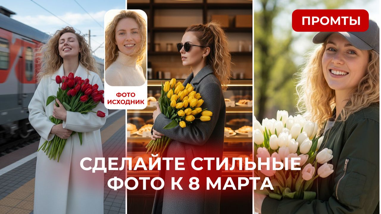 Переходите по ссылке https://syntx.ai/welcome/6Ci96o04 в бот. В этом боте можно делать все, что угодно, там есть несколько пробных бесплатных генераций, а самый базовый пакет стоит 890 Р в месяц. Хотите попрактиковаться оплачивайте, если нужна только 1 картинка, то можно воспользоваться пробными токенами. 1. Заходим в ТГ бот и переходим в раздел «Дизайн» 2. Выбираем Nano Banana Pro 3. Через скрепку добавляем свое фото анфас, можно любое селфи 4. Добавляем промт Для фотографии на жд вокзале нужно заранее подготовить любую картинку поезда на пироне, если вам нужен не ржд, просто уберите это из промта оставив отсылку к второй фотографии референсу, фото поезда загружаете вторым после своего селфи. 1 ПРОМТ на ЖД вокзале (первое фото): «Молодая женщина с фото референса стоит на платформе железнодорожной станции с фото референса 2. Она держит в руках большой букет красных тюльпанов. Женщина одета в светлое (молочное) пальто стиль 2026, ее длинные волосы как на фото референсе развеваются от ветра. Выражение ее лица радостное глаза прикрыты от ветра. Она находится в центре кадра, ее поза прямолинейная. За ней, на заднем плане, размытый силуэт движущегося поезда РЖД как на фото референсе 2. Небо голубое и ясное. Платформа вымощена плиткой как на фото референсе 2. Композиция предполагает перспективу, направленную к горизонту. Стиль изображения реалистичный с небольшим уклоном в художественность, подчеркивающим драматичность сцены и настроение ожидания. Основной акцент сделан на эмоциях и деталях, таких как цветы и развевающиеся волосы.» 2 Если вам нужна конкретная кофейня или пекарня, загрузите ее фото в бот вторым после своего селфи и в тексте промта , где описана буд=лочная напишите отсылку ко 2 фото референсу для создания обстановки как на фото ПРОМТ в булочной (2 фото): «Молодая женщина, с фото референса, одета в серое пальто, держит букет желтых тюльпанов. На ней черные круглые солнцезащитные очки и маленькие золотые серьги-кольца. Волосы собраны в высокий хвост. Женщина стоит в профиль, слегка повернувшись к зрителю, взгляд направлен в сторону. Выражение лица спокойное. В руках держит большой букет желтых тюльпанов. Стоит в кафе, освещенном верхним светом, на фоне витрины с выпечкой, ценниками. Камера фиксирует вид сбоку, демонстрируя композицию. Освещение мягкое, естественное, создающее атмосферу тепла и уюта. Фон размытый, акцентируя внимание на женщине и цветах. Цветовая палитра теплая, преобладают серый, желтый и коричневый цвета. Стиль - современный, с акцентом на модном образе и повседневной элегантности.» 3 Если вам нужна конкретная локация, скидываем ее изображение вторым фото в бот после селфи и описываем в промте , что девушка должна стоять в обстановке как на фото рефересне. ПРОМТ в городе (третье фото): «Красивая молодая женщина с фото референса, держит в руках букет белых тюльпанов. Она стоит на улице, вероятно, в городе, сзади видны здания из красного кирпича и деревья. Женщина улыбается, смотря в камеру. На ней надета темно-зеленая куртка-бомбер, серая кепка с надписью "NY" и волосы как на фото референсе. Ее лицо выглядит ухоженным с выразительными чертами. Свет яркий, естественный, подчеркивающий цвета и детали. Она стоит немного сбоку, держа цветы так, что они занимают значительную часть кадра, создавая ощущение теплоты и весеннего настроения. Фон размыт, что п
