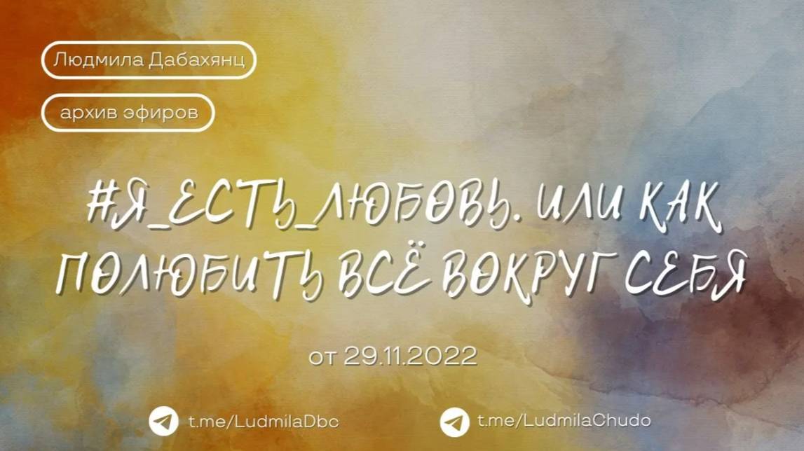 Эфир от 29.11.22 На тему "#Я_ЕСТЬ_ЛЮБОВЬ. Или как полюбить всё вокруг себя". ТЫ МОЖЕШЬ ПРИЙТИ СО СВОИМ ЗАПРОСОМ! Пишите в личку в telegram: https://t.me/ludmiladbc ✓ Обязательно поставь 💗 ✓ Подпишись на канал ✓ И поделись с близкими Это будет вашим балансом за движение и получение энергии. Если есть желание создать баланс брать-давать... приму от всего сердца с благословением (донейшн) С Огромной Любовью, Дабахянц Людмила 💓 ✨ Telegram: https://t.me/ludmiladbc ✨ Канал в telegram “Я ЕСТЬ ТО, ЧТО Я ЕСТЬ”: https://t.me/LudmilaChudo ✨Онлайн-школа: https://ludmilachudo.skillspace.ru/school