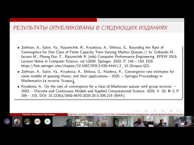 https://events.rudn.ru/event/131/ 20 мая 2021 г. в 15:00 в Российском университете дружбы народов по адресу г. Москва, ул. Миклухо-Маклая, 6, зал Ректората состоится Защита диссертации Крюковой Анастасии Леонидовны на тему «Оценки скорости сходимости и построение предельных характеристик для нестационарных марковских моделей массового обслуживания», представленной на соискание ученой степени кандидата физико-математических наук по специальности 05.13.18 — Математическое моделирование, численные методы и комплексы программ. Научный руководитель: д.ф.-м.н., профессор Зейфман Александр Израилевич.