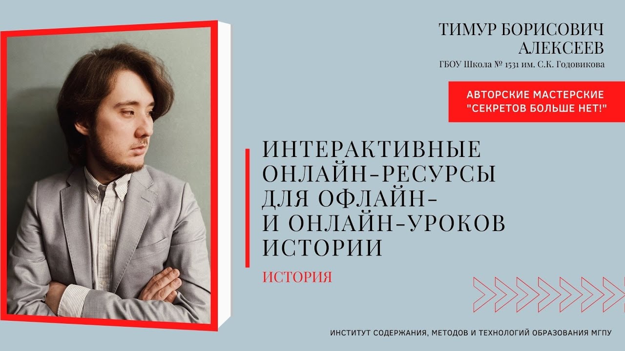 Ведущий мастерской: Тимур Борисович Алексеев, учитель истории ГБОУ Школа № 1531 имени С.К. Годовикова Тема: "Интерактивные онлайн-ресурсы для офлайн- и онлайн-уроков истории"