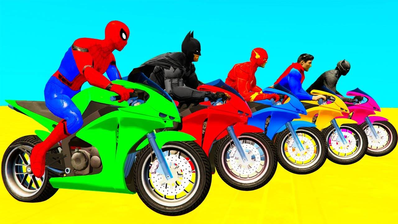 Смешные Супергерои катаются на цветных мотоциклах и велосипедах. Мультфильмы для детей и малышей.