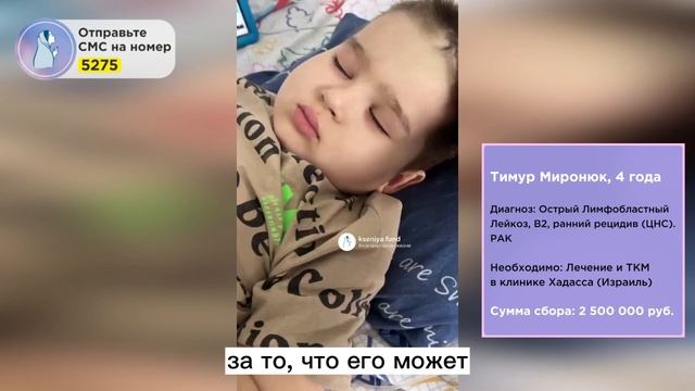 Дорогие друзья! Мама нашего нового подопечного Тимура из последних сил сражается за жизнь своего сына! Его уже во второй раз хочет забрать жестокая онкология! И мы, с вами призваны помочь мальчику! Ведь тает время и единственные оставшиеся надежды! Пожалуйста, спасите жизнь Тимурчику, ему не выкарабкаться без Вас! Когда он родился, малыша принесли маме укутанного в пелёночку с серыми звёздочками. Она была так счастлива и даже не могла поверить, что этот комочек, с пухленькими губками – её сынок. На затылке у Тимурчика было родимое пятнышко, и когда она его увидела, то подумала, что сыночек, поцелованный Богом. Но РАК захотел помешать счастливой жизни этой любящей семьи! Он развел родителей, а бороться с общей бедой осталась мама мальчика. Маме не спасти Тимура без Вас, наши добрые сердца! Тимур Миронюк Диагноз: Острый Лимфобластный Лейкоз, B2, ранний рецидив (ЦНС). Рак. Необходимо: Лечение и ТКМ в клинике Хадасса (Израиль) Сумма сбора: 2 500 000 рублей Полная история Тимурчика на нашем сайте: https://kseniya.fund/komu-pomoch/timur-mironuk/?FAND=rutube Отправьте СМС: - на номер 3434 со словами «Лечим Тимура» и любой суммой. Пример: Лечим Тимура 350; - на номер 5275 и в сообщении укажите цифрами сумму пожертвования в рублях. Пример: 350. Банковские реквизиты: Получатель платежа: Благотворительный фонд «Ксения Спасает Жизни» ИНН 7814779325 КПП 781401001 ОГРН 1207800101497 ПАО «Сбербанк» Р/с 40701810755000000688 Банк: Северо-Западный банк ПАО Сбербанк БИК: 044030653 К/с 30101810500000000653 Назначение платежа: Благотворительное пожертвование для Тимура Миронюк. #тимурмиронюк_бфксения #лейкоз #ракуходи #детскиймир #мальчишки #мывместе #тимурик #сынок #ксенияспасаетжизни