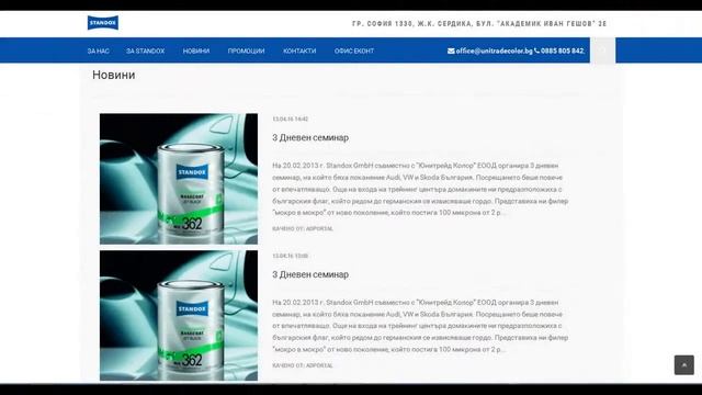 “Юнитрейд Колор“ ЕООД е създадена през далечната 1990 г. като част от компанията Юнитрейд, официален вносител на Фолксваген за България. Мисията на фирмата по това време е била първа да подбере и внесе водеща марка автомобилна боя. Концепцията бързо се развива и още през същата 1990 г. Юнитрейд предлага първите за България обучения за бояджии със съвместно участие на приложни техници от Германия. През 2010 г. компанията единствена за България получава лиценз да издава държавни дипломи за бояджии и колористи. Сред първите партньори оценили високо предлаганите от нас услуги са Мото Пфое България, Фолксваген и Ауди. Тези три бранда, заедно с Опел, Киа и Шкода на по-късен етап, изграждат гръбнака на Standox България повече от две десетилетия. “Юнитрейд Колор” ЕООД е и първият официален вносител на 3М за България. От 2012 компанията взима и правата на 4CR, Challenger, Dupont-Sontara и Finixa за страната. Основен партньор сме на Festool, Sata, Devilbiss, Beta и Кimberly-clark. Първи в България въведохме UV-технологията. Характерното при нас е, че Standox единствено се ориетира и патентова UV-технологията на базата на α-лъчите, което гарантира съхнене на кита – за 10 до 20 секунди, съхненето на филера – за 10 до 20 секунди, а това на лака – от 2 до 5 минути в зависимост от площта. Тази характерност, бързина на технологията ни прави най-атрактивни за Рапид сервизи, където идеята е докато ВИП клиентът изчаква в кафето, колата му да е готова за издаване, както е в една авто мивка. Нано технологията в безцветните лакове – патентованият Platinum лак съдържа нано частици, които се натрупват на повърхността на лака и му доставят дълготрайност, устойчивост на надраскване, гланцов финиш. Продуктът е използван в производството и рефиниша на Мерцедес. С какво се отличаваме: „Юнитрейд Колор“ ЕООД, въпреки своята впечатляваща за страната ни 23 годишна история, е млада иновативна фирма, чийто фокус не попада върху продажбата на продукти, а предлагането на готови решения, предосатавянето на адекватни услуги. Всеки един от екипа ни притежава качества, отговарящи на изискванията за висок стандарт на обслужване на клиентите: дългогодишен професионален опит, висок морал и отдаденост на работата. От 2009 г. фирмата е сертифицирана по ISO 9001, а от 2007 г. ползва ERP интелигентна система за управление на всички процеси във фирмата.