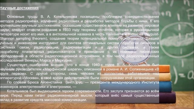 6 сентября исполняется 114 лет Котельникову Владимиру Александровичу (1908-2005) - советскому и российскому учёному в области радиофизики, радиотехники, электроники, информатики, радиоастрономии и криптографии. Отдел автоматизации библиотечных процессов центральной модельной библиотеки приглашает к просмотру видеобиографии «PRO Котельников».