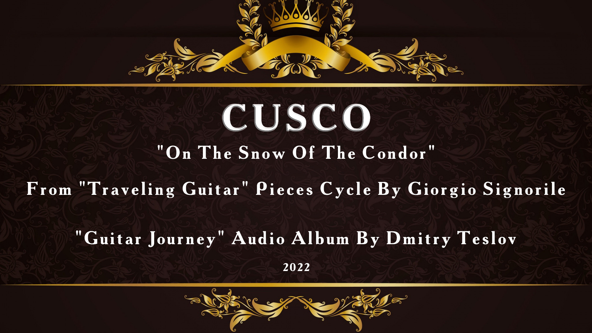 "Куско" ("На снегу Кондора") из цикла пьес Джорджио Синьориль "Путешествующая гитара". Аудиоальбом Дмитрия ТЕСЛОВА "Путешествие Гитары" (2022 г.). Подробно, скачать: http://teslov-music.ru/teslov-audio_guitar_journey_2022.htm.