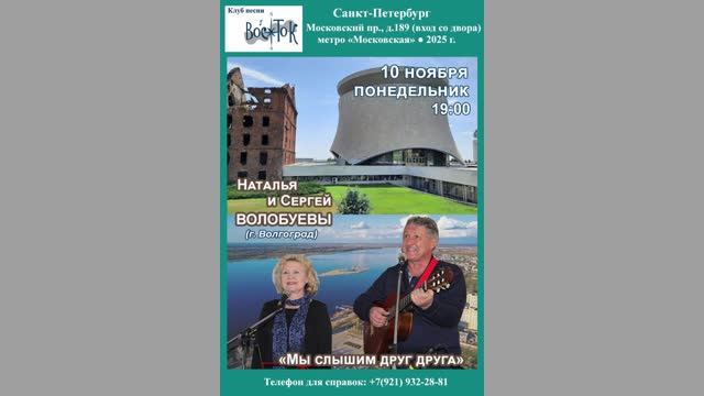 Наталья и Сергей Волобуевы (г. Волгоград). «Мы слышим друг друга». Клуб песни «Восток». 10 ноября 2025 г. Видеозапись - Алла Левитан. Запись звука - Герман Колосов. Афиша - Лев Мильчин. Санкт-Петербург, Московский пр., д. 189.