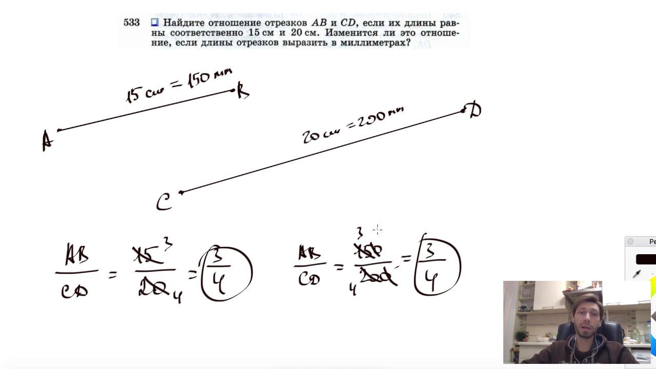 №533. Найдите отношение отрезков АВ и CD, если их длины равны соответственно 15 см и 20 см. Изменится ли это отношение, если длины отрезков выразить в миллиметрах? Поддержать канал рублём - 5469400944002125 (Сбербанк) Мой второй канал для подготовки к ЕГЭ и ОГЭ - https://www.youtube.com/ЕвгенийСумин Инстаграм - https://www.instagram.com/EGE_OGE.math Личный инстаграм - https://www.instagram.com/ee_sumin VK - https://vk.com/evgeniysumin FB - https://www.facebook.com/EvgeniySumin