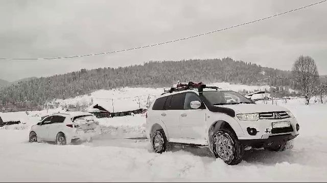 Попытка вытащить КИА из снега обычным тросом.
