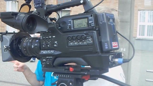 Hoši z regionální tv s kamerou na zastávce tramvaje.