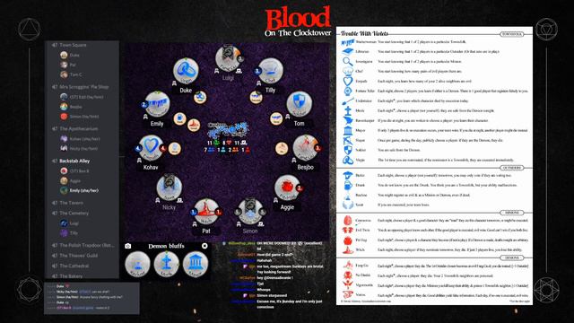 During our Saturday mega-stream, we ran a speedy little game of this ridiculously simple, custom script. It has all of the evils from Sects & Violets, and all of the goodies from Trouble Brewing. It ended up being predictably nuts, so we've preserved it for all to see! Full image of the character sheet can be found here: https://i.imgur.com/bYTgMc8.png Storyteller for this game: Ben Burns (community manager for the Pandemonium Institute) Join us for the streams over at https://www.twitch.tv/thepandemoniuminstitute Find out more at https://bloodontheclocktower.com/