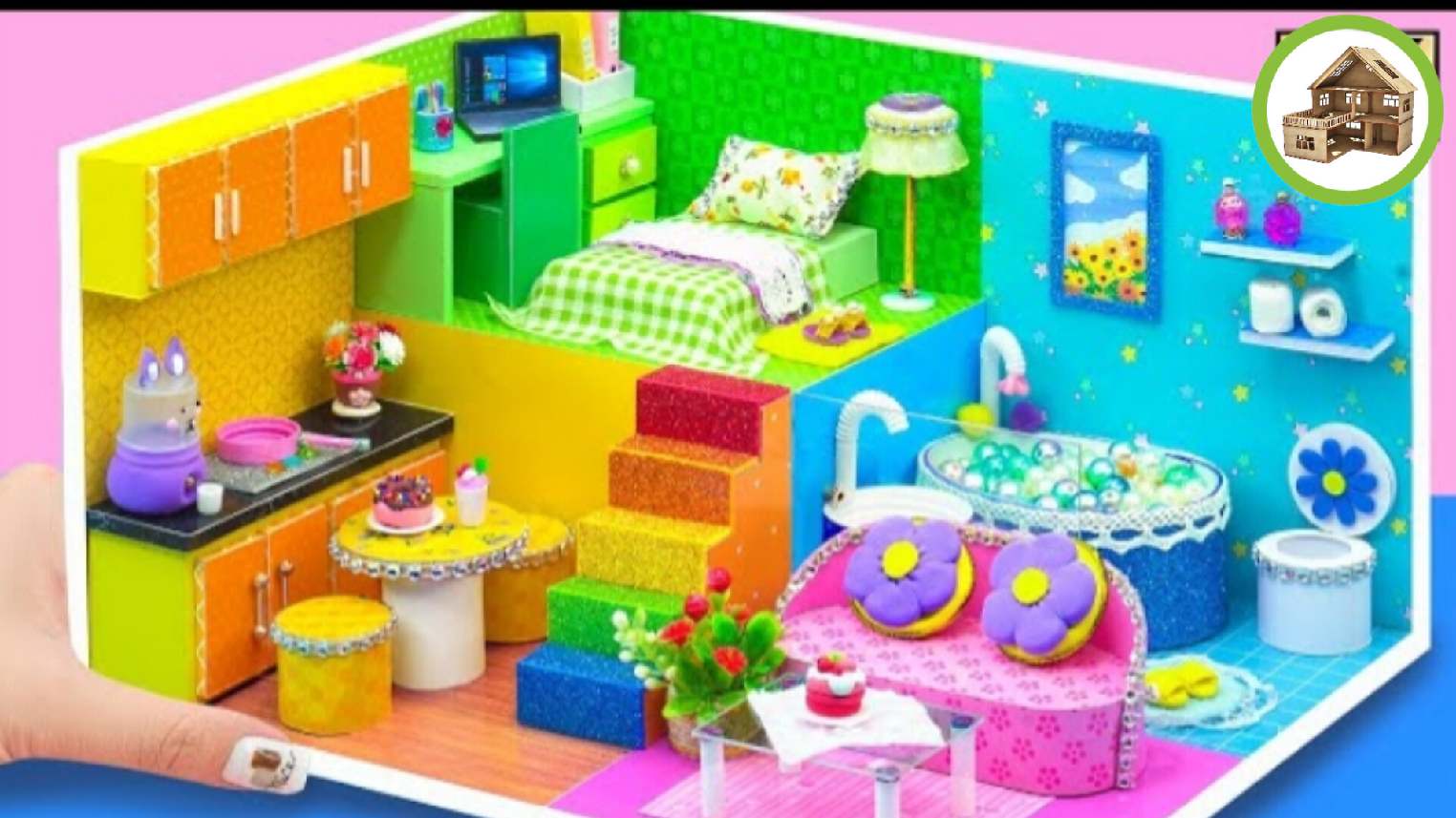 Миниатюрный четырех комнатный домик мечты со всеми удобствами и красивыми цветами из картона /225