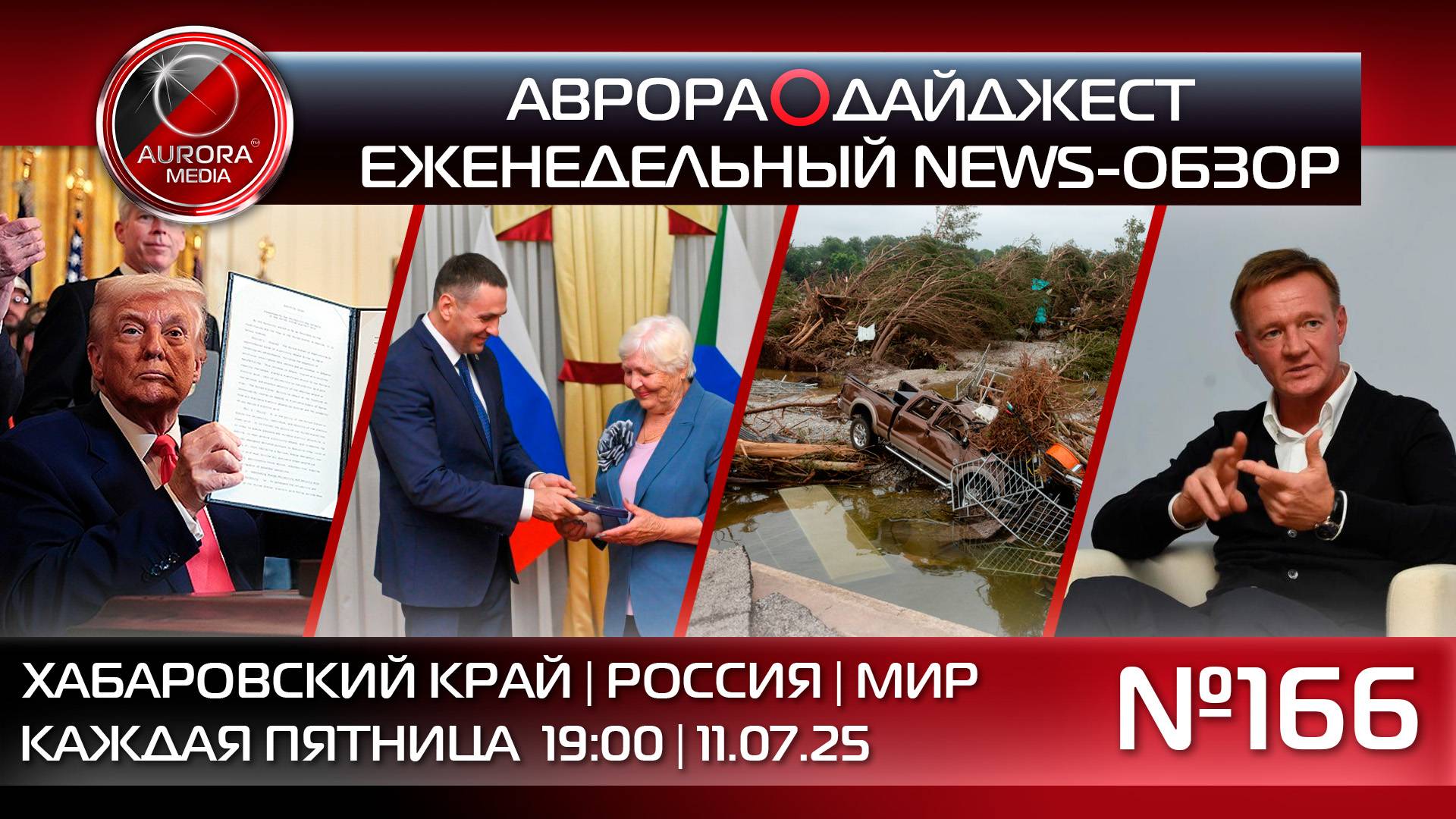 АВРОРА⭕️МЕДИА ЕЖЕНЕДЕЛЬНЫЙ ВИДЕО NEWS-РАЗБОР НЕДЕЛЯ | 04.07.2025 - 11.07.2025 АВРОРА⭕️ДАЙДЖЕСТ №166 НОВОСТИ ХАБАРОВСКОГО КРАЯ 🚩 Торжественная церемония, посвященная Дню семьи, любви и верности, состоялась в краевой столице 🚩 Дмитрий Демешин объявил о старте программы содействия профессиональному обучению и трудоустройству ветеранов СВО 🚩 Дмитрий Демешин проинспектировал организацию детского оздоровительного отдыха в крае 🚩 Достройка ЖК "Ленинградский" начнется летом этого года 🚩 Денис Чугунов стал призером всероссийских соревнований по армрестлингу "Кубок Отечества" 🚩 В Хабаровске прошёл мотопробег в честь Дня любви, семьи и верности НОВОСТИ РОССИИ 🚩 Уволенный экс-министр транспорта Роман Старовойт совершил самоубийство 🚩 Владимир Путин выступил на саммите БРИКС по видеосвязи НОВОСТИ МИРА 🚩 В результате масштабных наводнений в Техасе погибли не менее 104 человек 🚩 Президент США уведомил 14 стран о повышении торговых пошлин с 1 августа || Телеграмм-экосистема А⭕️М: | АВРОРА МЕДИА @aurora_media https://t.me/aurora_media | АВРОРА НОВОСТИ @news_aurora https://t.me/news_aurora | АВРОРА ХАБАРОВСК @khv_aurora https://t.me/khv_aurora | АВРОРА ЛАЙФ @life_aurora https://t.me/life_aurora | АВРОРА СПОРТ @sport_aurora https://t.me/sport_aurora | АВРОРА ГЕРЛС @girl_aurora https://t.me/girl_aurora | АВРОРА ХАЙТЕК @ht_aurora https://t.me/ht_aurora | АВРОРА ПЕРСОНЫ @people_aurora https://t.me/people_aurora | АВРОРА ИНСАЙД @media_aurora https://t.me/media_aurora | АВРОРА КРИМИНАЛ @crime_aurora https://t.me/crime_aurora | АВРОРА МОЛОДОСТЬ @aurora_young https://t.me/aurora_young || Aurora_Media: | Российское Информационное Агентство | +7(4212)900-900 media@auroragroup.info