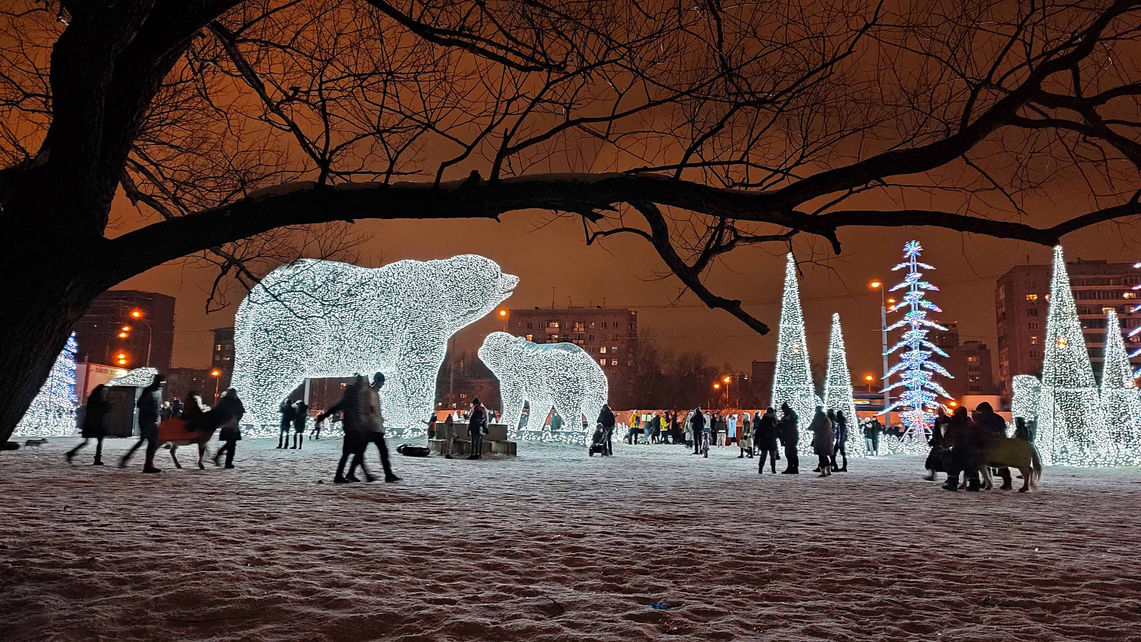Фигуры белых мишек уже несколько лет радуют жителей и гостей Москвы. В 2022 году эта световая композиция расположилась на проспекте Мира, недалеко от Ростокинского акведука.