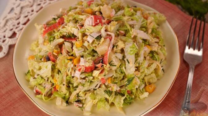 Из категории экспресс-блюд. САЛАТ С КРАБОВЫМИ ПАЛОЧКАМИ, ПЕКИНСКОЙ КАПУСТОЙ И АНАНАСАМИ