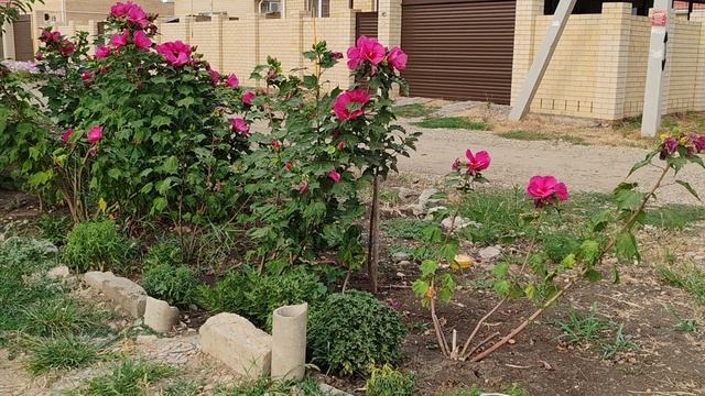 Травянистые гибискусы и петуньи в палисадниках КП "Южная столица". Краснодар, Южный, ул. Лазаревская