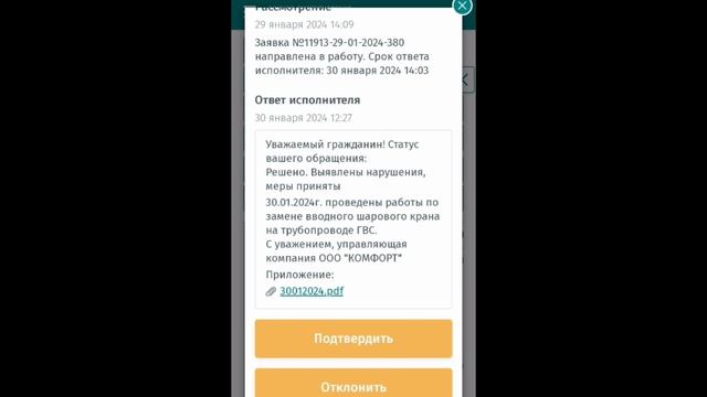 Всем добрый день. Вчера написала заявку через сайт ЕДС МО, вечером позвонил бригадир сантехников из уо ООО Комфорт и мы договорились о времени на сегодня. Изначально сотрудники пришли для проверки моих слов, так как видео нельзя загрузить на данный сайт. Сам сотрудник убедился, что действительно факт подтверждается, данный вентиль не выполняет свои функции. Через час пришли сотрудники в количестве двух человек, ведь необходимо слить воду в трубе ( а это делается в подвале). Заменили ВЕНТИЛЬ. Эта услуга абсолютно бесплатна, так как вы ежедневно оплачиваете услуги ЖКХ. После вам должны выдать ДВА акта выполненных работ на руки: 1) акт замены вентиля 2) акт замены номера клеммы на ваш счётчик, рядом с которым находится данный вентиль. P.S. все эти акты у вас должны быть на руках, ведь когда придут сотрудники ( раз в пять лет) для поверки счётчиков, то номера у вас не будут совпадать с первым актом установки !!! И это доказательства, что не вы что-то делали с ними! Предыдущий ВЕНТИЛЬ прослужил 4 года! По этой причине все акты можно смело скидывать в папку со счётчиками воды, чтобы потом не искать все документы в разных местах. Так же сотрудник сказал, что когда он идёт на работу, то аналогично у себя дома перекрывает все эти вентили и когда приходит на обед - открывает, а уходя аналогично закрывает. И уж тем более, если вы уезжаете на долго, например более 6 часов из дома, то есть смысл закрывать эти вентили. Всем безопасного города и жилья! #2024 #едсмо #вентиль #вода #ответ
