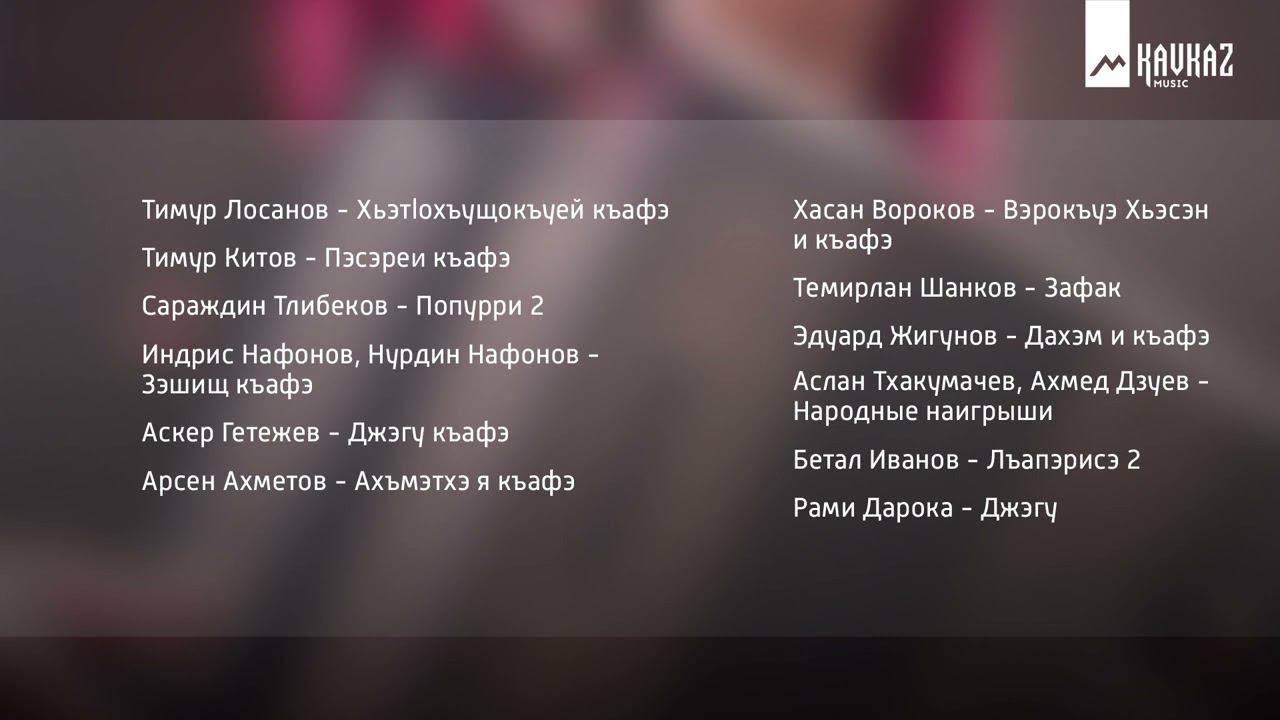 01 Тимур Лосанов Хьэтlохъущокъуей къафэ Инстр Т.Лосанов 00:00-3:50 02 Тимур Китов Пэсэрей къафэ (Древний танец) инстр Тимур Китов 3:50-6:05 03 Сараждин Тлибеков Попурри 2 инстр Н, Сараждин Тлибеков 6:05-9:40 04 Индрис Нафонов, Нурдин Нафонов Зэшищ къафэ инстр Роман Шанков 9:40-13:00 05 Аскер Гетежев Джэгу къафэ инстр Альберт Теуников 13:00-15:50 06 Арсен Ахметов Ахъмэтхэ я къафэ (Кафа Ахметовых) инстр Роман Шанков 15:50-19:45 07 Хасан Вороков Вэрокъуэ Хьэсэн и къафэ инстр Хасан Вороков 19:45-22:30 08 Темирлан Шанков Зафак инстр Н, Темирлан Шанков 22:30-25:35 09 Эдуард Жигунов Дахэм и къафэ (Танец красавицы) инстр Мурадин Думанов, Эдуард Жигунов 25:35-29:05 10 Аслан Тхакумачев, Ахмед Дзуев Народные наигрыши инстр Н, Аслан Тхакумачев, Ахмед Дзуев 29:05-33:15 11 Бетал Иванов Лъапэрисэ 2 Инстр Н, Бетал Иванов 33:15-38:05 12 Рами Дарока Джэгу инстр Н, Рами Дарока 38:05 KAVKAZ MUSIC объединяет и транслирует этническую музыку народов Кавказа. Подписывайся: YouTube: https://youtube.com/kavkazmusictv ВКонтакте: https://vk.com/kavkazmusictv Одноклассники: https://www.ok.ru/kavkazmusictv #KavkazMusic #КавказскаяМузыка #МузыкаКавказа