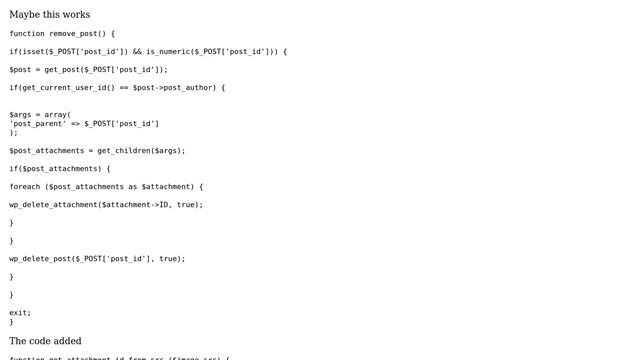 Wordpress: delete post also attachments Helpful? Please support me on Patreon: https://www.patreon.com/roelvandepaar With thanks & praise to God, and with thanks to the many people who have made this project possible! | Content (except music & images) licensed under cc by-sa 3.0 | Music: https://www.bensound.com/royalty-free-music | Images: https://stocksnap.io/license & others | With thanks to user keatch (https://wordpress.stackexchange.com/users/2727), user boranb (https://wordpress.stackexchange.com/users/9728), user Andres Yanez (https://wordpress.stackexchange.com/users/10229), and the Stack Exchange Network (http://wordpress.stackexchange.com/questions/34626). Trademarks are property of their respective owners. Disclaimer: All information is provided "AS IS" without warranty of any kind. You are responsible for your own actions. Please contact me if anything is amiss at Roel D.OT VandePaar A.T gmail.com.