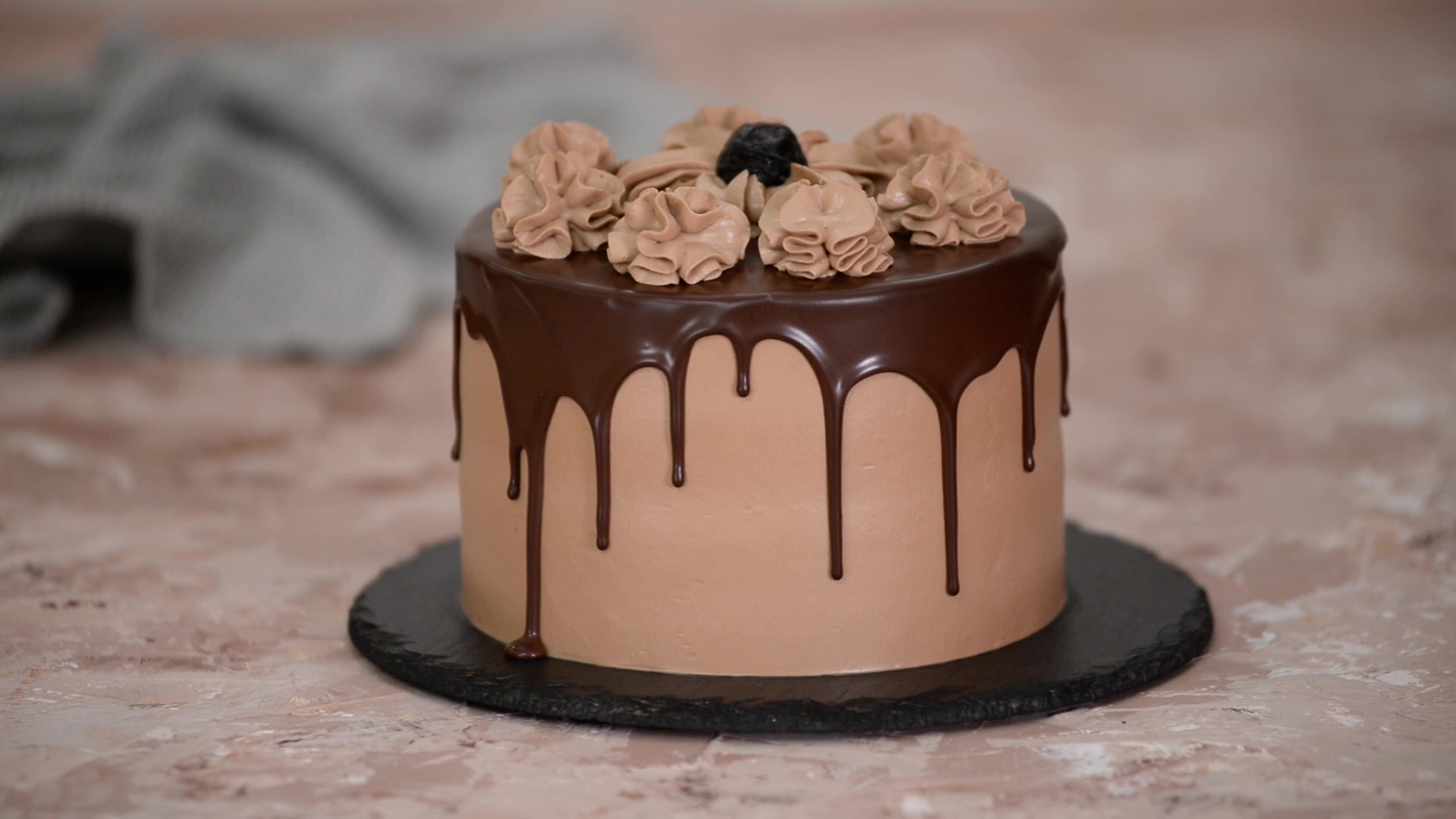 Ингредиенты: «Вес торта — 1700 грамм» Для шоколадного бисквита: Яйца «категория С0» — 3 шт. Сахар — 120 г. Молоко — 60 мл. Растительное масло «рафинированное» — 45 мл. Мука — 100 г. Какао-порошок — 25 г. Соль — щепотка Разрыхлитель — 5 г. Ванильный экстракт — 2 ч.л. Для макового бисквита: Яйца «категория С0» — 2 шт. Сахар — 75 г. Молоко — 40 мл. Растительное масло «рафинированное» — 30 мл. Мука — 90 г. Семена мака — 30 г. Соль — щепотка Разрыхлитель — 4 г. Ванильный экстракт — 2 ч.л. Для крема: Охлаждённого сливочного сыра — 350 г. Охлаждённые сливки 33-35% — 400 мл. Сахарная пудра — 120 г. Тёмный шоколад — 120 г. Горячие сливки 33-35% — 150 мл. Для начинки: Чернослив — 150 г. Ликёр «Амаретто» — 30 мл. Для шоколадной глазури: Тёмный шоколад — 70 г. Горячие сливки 33-35% — 90 мл. Все ингредиенты для бисквита должны быть комнатной температуры. 1. Чернослив мелко нарезать и залить ликёром. Затянуть миску пищевой пленкой и оставить чернослив настаиваться на 3-4 часа. Если вы используете сухой чернослив, то предварительно его нужно замочить в воде. 2. Разогреть духовку до 170 °С. 3. Приготовить шоколадный бисквит. В миске смешать муку, какао-порошок, соль и разрыхлитель, отложить в сторону. Яйца соединить в миске с сахаром и взбить миксером добела, на максимальной скорости. Масса должна посветлеть и увеличиться в объёме. Затем снизить скорость миксера до минимальной и добавить ванильный экстракт, растительное масло и молоко, перемешать до однородности. В полученную массу постепенно ввести сухие ингредиенты, аккуратно перемешать лопаткой снизу вверх. Готовое тесто вылить в форму диаметром 18 см, предварительно застеленную пергаментной бумагой. Выпекать в разогретой духовке 35-40 минут. Готовность бисквита проверить деревянной шпажкой, если при прокалывании она выходит чистой из бисквита — значит он готов. 4. Готовый бисквит вынуть из духовки и дать остыть в течение 10 минут. Затем вынуть из формы и дать полностью остыть на решётке. 5. Приготовить маковый бисквит. В миске смешать муку, семена мака, соль и разрыхлитель, отложить в сторону. Яйца соединить в миске с сахаром и взбить миксером добела, на максимальной скорости. Масса должна посветлеть и увеличиться в объёме. Затем снизить скорость миксера до минимальной и добавить ванильный экстракт, растительное масло и молоко, перемешать до однородности. В полученную массу постепенно ввести сухие ингредиенты, аккуратно перемешать лопаткой снизу вверх. Готовое тесто вылить в форму диаметром 18 см, предварительно застеленную пергаментной бумагой. Выпекать в разогретой духовке 30-35 минут. Готовность бисквита проверить деревянной шпажкой, если при прокалывании она выходит чистой из бисквита — значит он готов. 6. Готовый бисквит вынуть из духовки и дать остыть в течение 10 минут. Затем вынуть из формы и дать полностью остыть на решётке. 7. Приготовить шоколадный крем. Тёмный шоколад залить горячими сливками и хорошо перемешать до полного растворения шоколада, полученную массу остудить до комнатной температуры. В другой миске соединить сливочный сыр, сахарную пудру, остывшую шоколадную массу и охлаждённые сливки, взбить миксером до крепких пиков. Готовый крем переложить в кондитерский мешок с круглой насадкой. 8. Собрать торт. Каждый бисквит разрезать на две равные части. Первый шоколадный корж положить на подставку для торта, сверху на корж положи