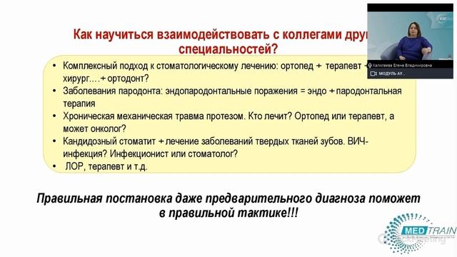 Бесплатный вебинар от УЦ «Медтрейн» https://medtrain.ru/ Дистанционное обучение «Актуальные вопросы терапевтической стоматологии» https://medtrain.ru/online-edu/aktualnye-voprosy-terapevticheskoy-stomatologii.html Вебинар ведет Халилаева Елена Владимировна – кандидат медицинских наук врач-стоматолог-терапевт высшей категории, специалист по заболеваниям слизистой оболочки рта (Oral Medicine). На вебинаре вы узнаете: – Современные подходы и методики лечения заболеваний полости рта. – Почему необходимо знать основы своей юридической специальности? – Как научиться взаимодействовать с коллегами других стоматологических специальностей? – Зачем нужны знания о профилактике врачу и пациенту? Превенция заболеваний - новая парадигма медицины.