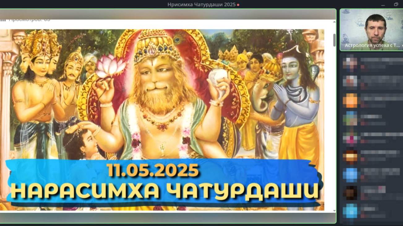 0:00:00 Начало эфира 0:02:20 О празднике Нрисимха Чатурдаши 0:06:31 Рекомендации по проведению праздника Нрисимха Чатурдаши 0:13:21 Цель прихода Господа Нрисимхи 0:20:22 Чтение молитвы 0:25:26 Чтение главы 8 Шримат Бхагаватан 0:44:33 Совместная практика повторения мантры ОМ НАМО БХАГАВАТЕ НРАСИМХАДЕВАЯ 1:00:16 Вопросы В программе: ✔️История о воплощении Господа Нрисимхи как полульва-получеловека. ✔️Значение праздника: как сила веры побеждает тьму. ✔️ Мантры и молитвы для привлечения благословений. ✔️ Ответы на вопросы в прямом эфире! Господь Нрисимхадев является божественным покровителем планеты Марс. Поклоняясь Гоподу Нрисимхадеву, мы тем самым усиливаем благоприятное влияние планеты Марс на свою судьбу. 🔔Не забудьте подписаться на уведомления, чтобы не пропустить эфир. Длительность встречи 60+ минут, будет сделана запись Если планируете участие -ставьте 👍, если посмотрите в записи жмите 🔥 До встречи в эфире! 🙏🕉 #Нрисимха #НрисимхаЧатурдаши #ДуховныйЭфир #ВедическиеПраздники #Благословения