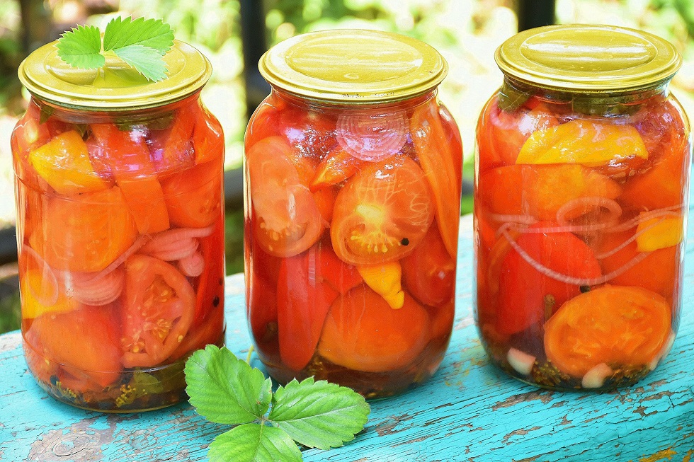 ?Необходимые ингредиенты: Помидоры, Болгарский перец, Красный лук в произвольном количестве; Вода; Чеснок, листья хрена, зонтики укропа, душистый и черный перец горошком, гвоздика. Лимонная кислота 1/3 ч. л. на одну литровую банку. Рассол на 1 литр воды: 50 г соли 70 г сахара. .......................................... Описание приготовления Подготовьте необходимые ингредиенты: помидоры порежьте четвертинками, перец дольками, а красный лук кружочками. На дно стерилизованной банки (данное количество рассчитано на 1 литровую банку) положите половинку зонтика укропа, небольшую часть листа хрена, 2 порезанных зубчика чеснока, 2 гвоздички, по 5 горошин душистого и черного перца. Выложите в банку помидоры, болгарский перец и лук, чередуя слои. Вскипятите воду, разлейте по банкам, прикройте крышками и оставьте на 10 минут. Через 10 минут слейте с банок воду в кастрюлю и на этой основе приготовьте рассол. Добавьте немного кипяченой воды, соль, сахар и закипятите повторно. В каждую банку положите необходимое количество лимонной кислоты, залейте готовым рассолом, закатайте крышками. Дайте остыть под одеялом и храните в кладовой или погребе до зимы. ???ПОДПИСЫВАЙТЕСЬ НА КАНАЛ, СТАВЬТЕ ЛАЙКИ, чтобы не пропустить новый ролик с быстрыми и вкусными рецептами. #заготовки #помидорыназиму #консервация