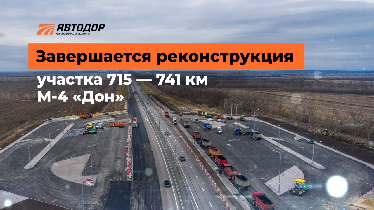 Продолжаем работы по реконструкции участка 715 — 777 км на М-4 «Дон» в Воронежской области. Проект разделен на 2 этапа: 1. 715 — 741 км. На этом участке реконструкция вошла в завершающую стадию — ввод в эксплуатацию намечен до конца этого года. Дорожники провели комплексное обустройство, установили опоры освещения, элементы автоматизированной системы управления дорожным движением, смонтировали барьерные ограждения и заканчивают работы на двух площадках отдыха на 731 км, по одной с каждой стороны трассы. На обеих площадках будут парковочные места как для легкового, так и для грузового транспорта, туалет, места для отдыха. 2. 741 — 777 км. Основную часть работ на этом участке планируется завершить в третьем квартале 2023 года. Здесь проектной документацией предусмотрена реконструкция полос обратного направления трассы М-4 «Дон», которые ведут в Москву, трех развязок: на 750 км у хутор Дядин, на 763 км у села Криница, на 771 км у населенных пунктов Кравцово и Плесновка. На 766 км трассы друг напротив друга будут организованы еще две площадки отдыха , а также расширена площадка на 777 км трассы на границе Воронежской и Ростовской областей. Ввод в эксплуатацию реконструированного участка 715 - 777 км, находящегося сразу за обходом Лосево-Павловска, позволит повысить пропускную способность М-4 «Дон» на границе Воронежской и Ростовской областей.