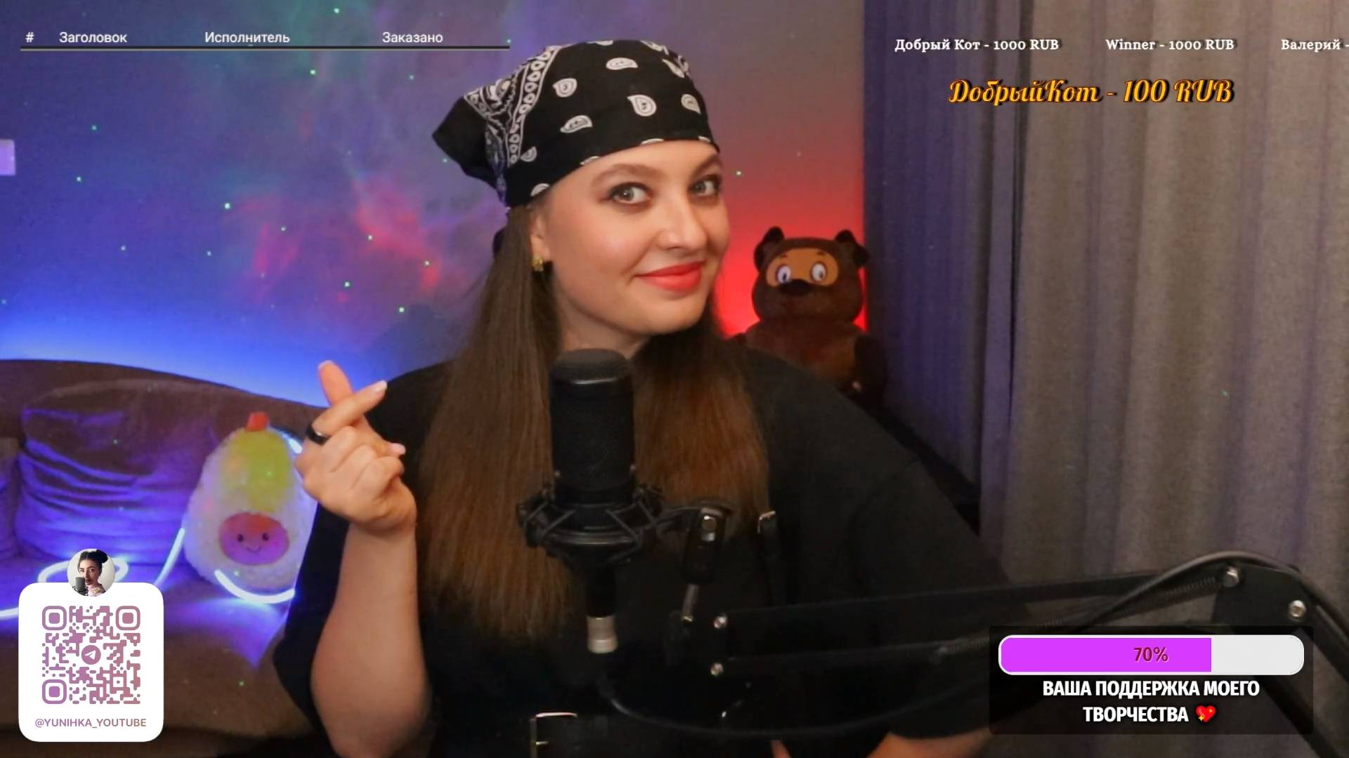 Привет, дорогой зритель! Меня зовут Юля, живу в самом красивом городе Санкт-Петербург, и я очень рада тебя видеть здесь на моем канале) Сегодня я провожу прямую трансляцию и поэтому прошу Тебя поддержать меня ну и конечно же петь песни вместе со мной 💖 Стримы проходят каждый ВТ и ЧТ в 19:30 по мск Возможны и выходные дни, смотри подробнее в группе ТГ 💎 Ссылка на донат ИЛИ если вы хотите увидеть свое сообщение на экране - https://www.donationalerts.com/r/yunihka или https://new.donatepay.ru/@1355734 💎 Если просто хотите поддержать мое творчество номер карты ТБАНК: 2200 7017 8469 2862 🌸 Заказ песни вне очереди 300 р. 🌸 Выучить песню от 1000 р. (на разучивание уходит от 1 до 2х недель в зависимости от сложности материала, если песня мне нравится и походит, если песня мне не подходит - ищем варианты замены) 🌸 Сигна (электронный автограф) с вашим ником 300 р. ЧТО Я МОГУ СПЕТЬ ДЛЯ ТЕБЯ смотри тут 👇 🌟 https://disk.yandex.ru/i/YTq-QLQ9VLuGvA 🌟 https://www.streamersonglist.com/t/yliannohka/songs 💎 Сигна разыгрывается на каждые 50 лайков 💎 Так же сигна разыгрывается на 100 лайков либо песня вне очереди, решает выигравший Хочу сказать огромное СПАСИБО всем донатерам и просто случайным зрителям! Я надеюсь Вам все понравится ❤️ ИЩИТЕ МЕНЯ ЗДЕСЬ: Инстаграм (запрещен в РФ): https://www.instagram.com/yunihka/ (@yunihka) Группа ВК: https://vk.com/yunihka Телеграмм: https://t.me/yunihka_youtube ТВИЧ: https://www.twitch.tv/yliannohka ВК плэй https://live.vkplay.ru/yunihka РУТУБ: https://rutube.ru/channel/7667529/ Бусти: https://boosty.to/yunihka #стрим#караоке#разговоры#живойзвук#вокал#живойвокал#поем#петь#музыка#поемкараоке#петькараоке#cover#music#стрим#прямойэфир#караоке