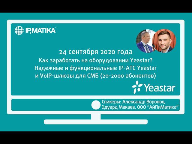 24 сентября 2020 года продакт-менеджер Александр Воронов и пресейл-инженер компании АйПиМатика по телефонным решениям Эдуард Макаев провели вебинар "Как заработать на оборудовании Yeastar? Надежные и функциональные IP-АТС и VoIP-шлюзы Yeastar для малого и среднего бизнеса от 20 до 2000 абонентов" Основные темы вебинара: - партнерская программа и условия сотрудничества; - продуктовая линейка VoIP-шлюзов; - продуктовая линейка IP PBX и CloudPBX; - единая система управления; - программные продукты.