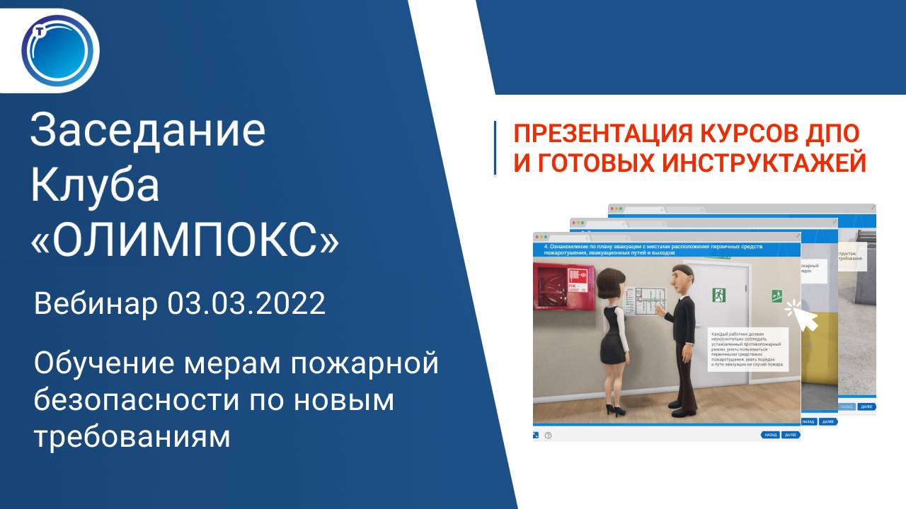 Участники мероприятия увидели презентацию готовых курсов линейки «ОКС:ДПО» для организации обучения по программам повышения квалификации и профессиональной переподготовки. Также участникам вебинара были предложены решения по организации всех видов противопожарных инструктажей с применением мультимедийных технологий. Эти методические продукты позволят проводить обучение мерам пожарной безопасности в соответствии с требованиями нового порядка, который начал действовать с 1 марта 2022 года. Вебинар состоялся 3 марта 2022 года. Подробнее о клубе: https://olimpoks.ru/events «ОЛИМПОКС» для учебных центров: https://olimpoks.ru/uc/ Купить «ОЛИМПОКС»: https://olimpoks.ru/buy
