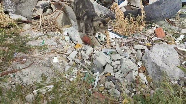 Котик ходит среди обломков бетона и арматуры