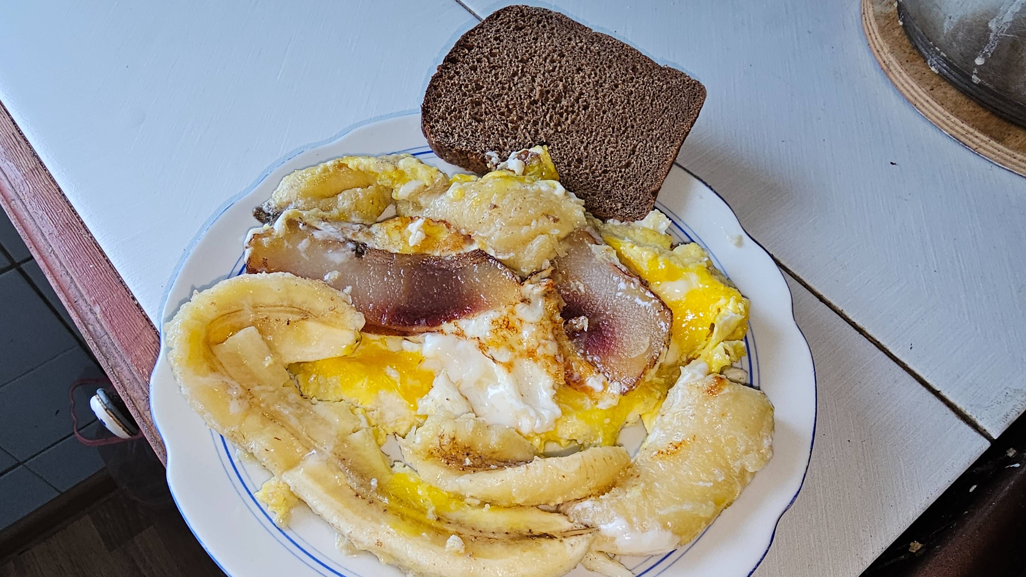 Предлагаем вам быстрый, полезный и калорийный завтрак. Незаменим в загородном доме. У нас были домашние кубанские яйца с двойным желтком, незрелые бананы и белорусское сало. Приятного аппетита.