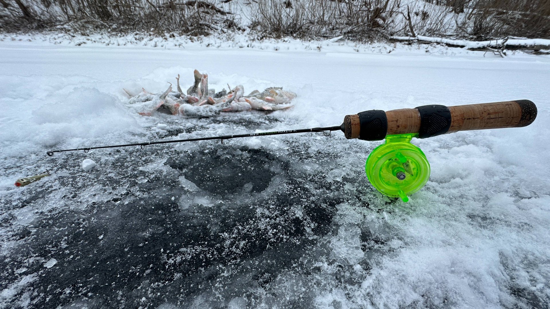 Только опустил блесну под лёд и сразу удар. Зимняя рыбалка