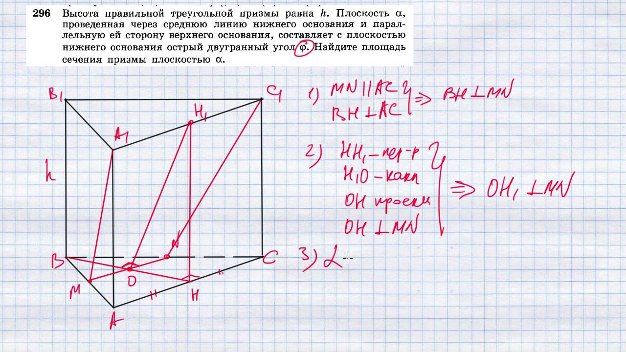 №296. Высота правильной треугольной призмы равна h. Плоскость α, проведенная через среднюю линию нижнего основания и параллельную ей сторону верхнего основания, составляет с плоскостью нижнего основания острый двугранный угол φ. Найдите площадь сечения, образованного плоскостью α. Мой второй канал для подготовки к ЕГЭ и ОГЭ - https://www.youtube.com/ЕвгенийСумин TikTok - https://vm.tiktok.com/WJJwK9 Like - https://likee.com/user/@ge0metriya Инстаграм - https://www.instagram.com/EGE_OGE.math Личный инстаграм - https://www.instagram.com/ee_sumin VK - https://vk.com/evgeniysumin FB - https://www.facebook.com/EvgeniySumin