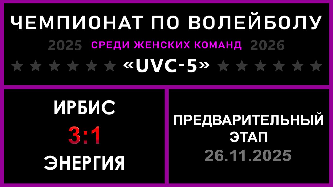 UVC-5 (Девушки): Чемпионат UVC Лиги по волейболу среди женских команд 2025-2026 гг. Результаты игры: Предварительный этап 26.11.2025 ИРБИС - Энергия 3:1 (25:14, 22:25, 25:18, 25:15) ИРБИС продолжает побеждать! В это раз, от рук ИРБИС пал многократный чемпион второго дивизиона - Энергия! На стороне победителей был весомый аргумент - пушечная подача! У Энергии не пошел прем и страдала организация атаки. ИРБИС практически гарантировал себе путевку в ТОР дивизион! 💪 «РЕШАЛЫ» - конкурс для команд : ✅ ИРБИС идет дальше! «Nostradamus trophy» - конкурс для участников группы ВКонтакте: ✅ 15 - количество участников, которые смогли предсказать точный исход матча! #UVC_ЛИГА_ЧЕМПИОНАТ_UVC_5_Девушки